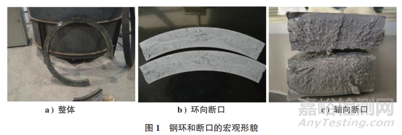 鋼環(huán)沿軸向斷裂為兩部分,其中一小段部分沿環(huán)向中心又?jǐn)嗔褳閮蓪迎h(huán)形斷口,小段部分外圓弧長(zhǎng)為485mm,約占外圓總周長(zhǎng)的1/6,鋼環(huán)和斷口的宏觀形貌如圖1所示。由圖1可知:整體斷面呈現(xiàn)金屬光澤,心部斷面粗糙;斷面存在從心部向四周發(fā)散的放射狀條紋,說(shuō)明裂紋起源于零件心部。距離鋼環(huán)外表面約5mm厚的區(qū)域呈現(xiàn)細(xì)瓷狀,該區(qū)域?yàn)榻K斷區(qū)。