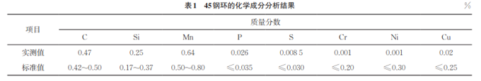 在斷裂的鋼環(huán)上截取試樣,采用電感耦合等離子體發(fā)射光譜儀對(duì)試樣進(jìn)行化學(xué)成分分析,結(jié)果如表1所示。由表1可知:鋼環(huán)原材料的化學(xué)成分符合GB/T 711—2017《優(yōu)質(zhì)碳素結(jié)構(gòu)鋼熱軋鋼板和鋼帶》對(duì)45鋼的要求。