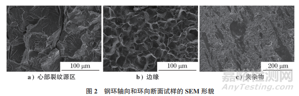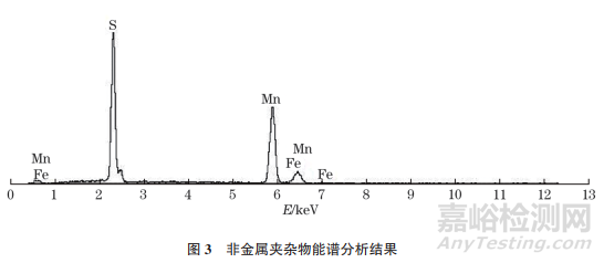 采用掃描電子顯微鏡對(duì)鋼環(huán)軸向和環(huán)向斷面進(jìn)行觀察,結(jié)果如圖2所示。由圖2可知:軸向斷口心部裂紋源區(qū)斷面上可見明顯的河流花樣,其為解理斷裂典型形貌[ 見圖2a)];斷口外表面5mm厚的細(xì)瓷區(qū)呈沿晶斷裂形貌[見圖2b)];環(huán)向斷口存在大量非金屬夾雜物[ 見圖2c)]。采用能譜儀對(duì)夾雜物進(jìn)行能譜分析,結(jié)果如圖3所示。由圖3可知,非金屬夾雜物成分主要為S元素和Mn元素,說(shuō)明該夾雜物為硫化錳。