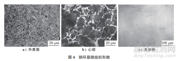 采用洛氏硬度計(jì)對(duì)淬火后鋼環(huán)外表面和心部進(jìn)行洛氏硬度測(cè)試,結(jié)果如表3所示。由表3可知:鋼環(huán)外表面硬度平均值為56HRC,符合該熱處理工藝