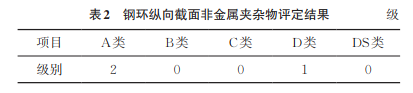 在斷裂的鋼環(huán)上截取試樣,將試樣打磨、拋光后,采用5%(體積分?jǐn)?shù))的硝酸水溶液腐蝕試樣,將試樣置于光學(xué)顯微鏡上觀察,結(jié)果如圖4所示。由圖4可知:腐蝕后試樣的顯微組織呈現(xiàn)明顯差別,外表面為馬氏體,心部為鐵素體+ 珠光體,可知外表面有深度約為5mm的淬透層,這與斷口宏觀形貌一致;鋼環(huán)縱向截面存在A類夾雜物(硫化物)。根據(jù) GB/T 10561—2023《鋼中非金屬夾雜物含量的測(cè)定 標(biāo)準(zhǔn)評(píng)級(jí)圖顯微檢驗(yàn)法》進(jìn)行非金屬夾雜物評(píng)級(jí),A類夾雜物評(píng)級(jí)為2級(jí)(見表2),該結(jié)果與斷口上發(fā)現(xiàn)的大量硫化錳夾雜一致。