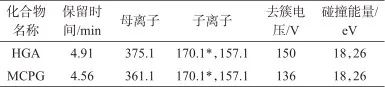 離子源:電噴霧離子源(AJS-ESI源);電離方式:正離子;毛細(xì)管電壓:3.5 kV;干燥器溫度350 ℃;干燥器流量8 L/min;霧化器壓力206.8 kPa;檢測方式:多反應(yīng)監(jiān)測(MRM)模式;MRM監(jiān)測離子對(duì)參數(shù)見表1。