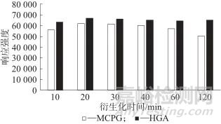圖2 兩種分析物不同衍生化時(shí)間響應(yīng)強(qiáng)度對(duì)比