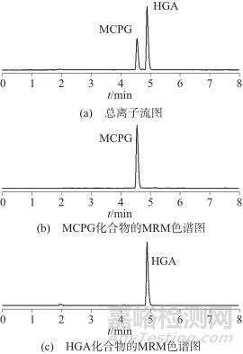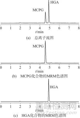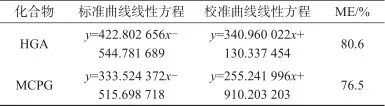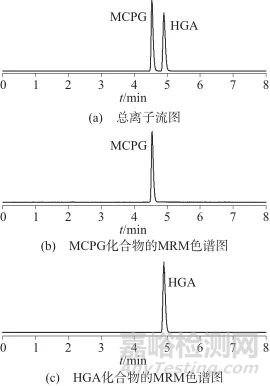 按儀器參考條件設(shè)定,將系列基質(zhì)混合標(biāo)準(zhǔn)溶液和試樣溶液等體積進(jìn)樣測定,得到相應(yīng)的標(biāo)準(zhǔn)溶液的色譜峰面積,以HGA和MCPG基質(zhì)標(biāo)準(zhǔn)溶液的濃度為橫坐標(biāo),以色譜峰的峰面積為縱坐標(biāo),繪制標(biāo)準(zhǔn)工作曲線,外標(biāo)法定量。