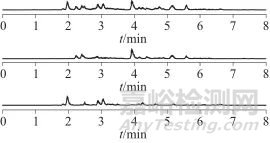 色譜柱:Water HSS T3 C18柱(100 mm×2.1 mm,1.8 μm,美國沃特世公司);柱溫:35 ℃;進(jìn)樣體積:5 μL;流動(dòng)相:A相為0.1%(體積分?jǐn)?shù))甲酸溶液,B相為乙腈,梯度洗脫程序:0~5 min,20%→80%乙腈;5~7 min,80%乙腈;7~7.1 min,80%→20%乙腈;7.1~8 min,20%乙腈,流量為0.3 mL/min。