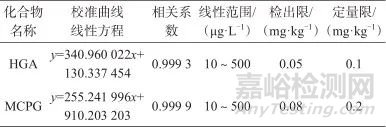 表3 兩種分析物的線性方程、相關(guān)系數(shù)、線性范圍和檢出限、定量限
