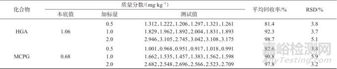 采用HPLC-MS/MS質(zhì)譜對(duì)荔枝中HGA和MCPG兩種降糖氨酸類成分進(jìn)行定量分析,以紅毛丹為空白基質(zhì)制作基質(zhì)校準(zhǔn)曲線,以目標(biāo)物的色譜峰面積為縱坐標(biāo)y,以目標(biāo)物的質(zhì)量濃度為橫坐標(biāo)x,繪制校準(zhǔn)曲線。兩種化合物在曲線范圍內(nèi)線性良好,相關(guān)系數(shù)均大于0.999。當(dāng)實(shí)際樣品取樣量為1 g,定容體積為10 mL,以信噪比為3和10時(shí)的進(jìn)樣質(zhì)量濃度點(diǎn)為儀器的檢出限和定量限,最終計(jì)算方法檢出限為HGA 0.05 mg/kg、MCPG 0.08 mg/kg;定量限為HGA 0.1 mg/kg、MCPG 0.2 mg/kg,見表3。
