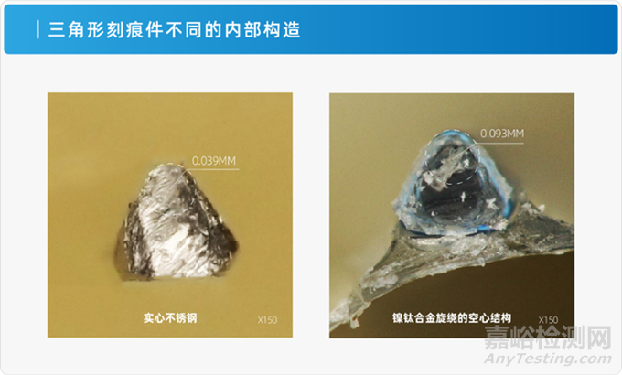 作為撬開頑固性病變的重要受力結(jié)構(gòu),刻痕件自身的剛性非常重要。剛性一方面由材料本身的楊氏模量來決定,楊氏模量越大,則代表材料剛性越強,硬度越硬。同材質(zhì)的材料,實心刻痕件的硬度大于使用合金絲纏繞得到的空心刻痕件。
