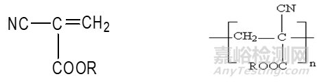 α-氰基丙烯酸酯類醫(yī)用粘合劑產(chǎn)品的單體成分為α-氰基丙烯酸酯,CH2=C(CN)-COOR,見結構式A;固化后形成聚(α-氰基丙烯酸酯),見結構式B。