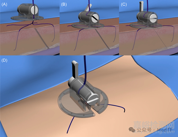LockeT由扁平的圓形底座、旋塞式縫合張緊機(jī)構(gòu)和縫線組成。旋塞式縫合張緊機(jī)構(gòu)位于圓形底座上方。LockeT可以通過將縫合張力分布在更大的區(qū)域范圍,實(shí)現(xiàn)持續(xù)的壓迫。
