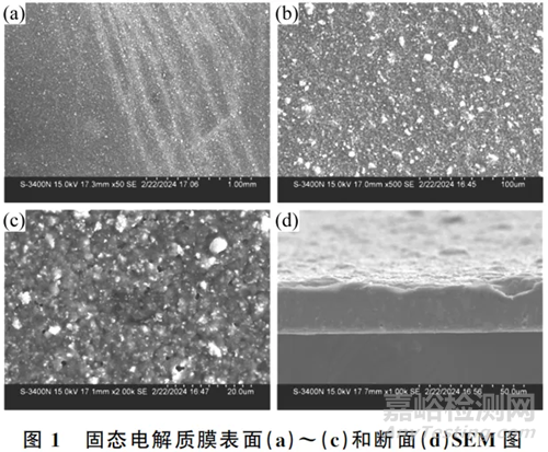 在露點不高于-40℃的干燥房中,將烘干后的固態(tài)電解質(zhì)膜用手術(shù)刀裁切后用導(dǎo)電膠固定在樣品臺上。表面噴金后,用鋁塑膜袋封裝,隨后快速轉(zhuǎn)移到掃描電子顯微鏡中,對固態(tài)電解質(zhì)膜的表面和斷面進(jìn)行SEM表征。