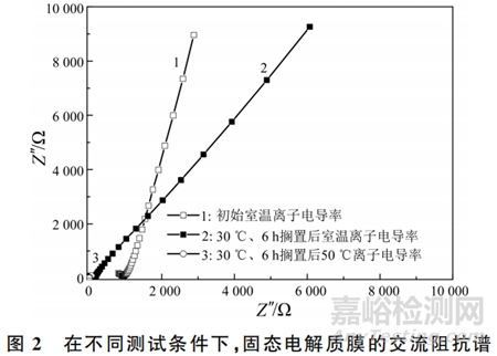 固態(tài)電解質(zhì)膜的離子電導(dǎo)率對電池性能起著決定性作用。圖2是不同測試條件下,固態(tài)電解質(zhì)膜的交流阻抗譜。