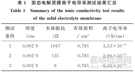 將固態(tài)電解質(zhì)膜沖切成直徑為19mm的圓片。在惰性氣體手套箱中,將固態(tài)電解質(zhì)膜圓片組裝成“不銹鋼墊片/固態(tài)電解質(zhì)膜/不銹鋼墊片/彈簧片”的CR2032扣式實驗電池。固態(tài)電解質(zhì)膜上按照膜面積滴加2.8mg/cm2的基礎(chǔ)電解液作為界面潤濕劑。采用電化學(xué)分析儀記錄CR2032扣式實驗電池的交流阻抗譜。具體測試條件如下。