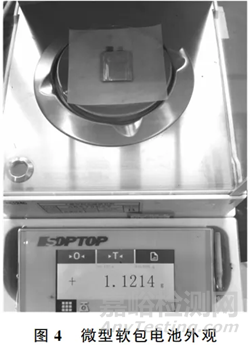 圖4展示了微型軟包電池稱重的情況,質(zhì)量為1.121g。