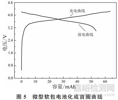 圖5是微型軟包電池的化成首圈曲線。微型軟包電池組裝后,初始電壓為0.5159V,充電容量為63.61mAh,放電容量為53.44mAh,化成首圈效率為84.02%。