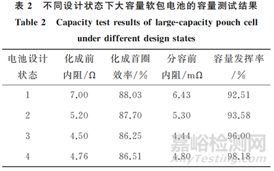 因軟包電池中電極層數(shù)多,影響因素復(fù)雜。一般通過比較電池的化成容量和設(shè)計容量來評估電池容量的發(fā)揮情況,這可以作為判斷電池設(shè)計是否合理的依據(jù)。