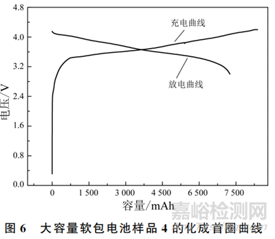 圖6是大容量軟包電池樣品4的化成首圈曲線。大容量軟包電池組裝后,初始電壓為0.3122V,充電容量為8384.0mAh,放電容量為7252.8mAh,化成首圈效率為86.51%。