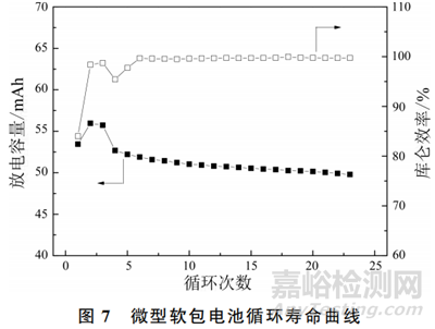 圖7展示了微型軟包電池循環(huán)壽命曲線,曲線包含了化成部分的充放電情況。在化成中,電池在0.05C倍率下放電容量分別是55.96mAh和55.720mAh。隨后電池0.02C放電容量為52.68mAh。并在第三次0.2C放電時,庫侖效率達(dá)到99.67%。并在之后的20次循環(huán)中始終保持在99%以上。電池0.2C放電循環(huán)充放電20次后,容量為49.78mAh,容量保持率為94.50%。