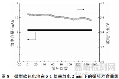 圖8展示了微型軟包電池在5C倍率放電2min下的循環(huán)壽命曲線。電池在150次循環(huán)充放電中,始終可以放出9.16mAh的容量。然而電池的放電中壓從最初的3.6478V降低到3.5709V,降低了76.9mV。