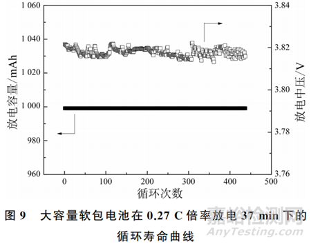 圖9展示了大容量軟包電池在低充放電深度下的循環(huán)壽命曲線。電池在439次循環(huán)充放電中,始終可以放出999.1mAh的容量,放電倍率為0.27C,放電深度為13.78%。放電中壓在循環(huán)過程中存在變化,可能是因為固液相混合界面有一定的不穩(wěn)定性。在