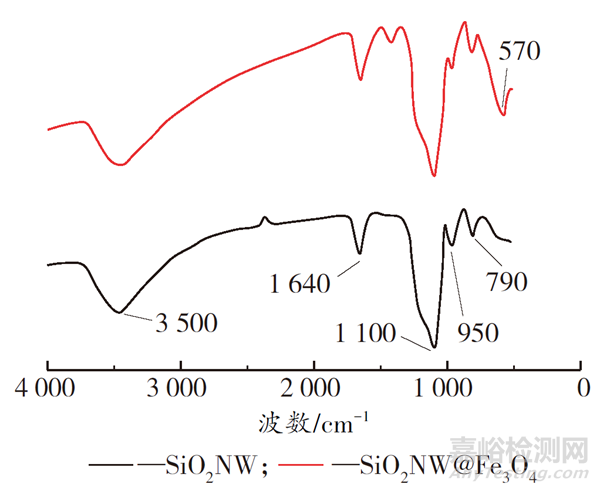 由圖2可以看出,3 500 cm-1處為O—H的伸縮振動(dòng)吸收峰,1 640 cm-1 處為C=O 伸縮振動(dòng)吸收峰,1 420 cm-1 處為C—H 彎曲振動(dòng)吸收峰,1 100 cm-1 為Si—O—Si鍵的反對(duì)稱伸縮振動(dòng)吸收峰,950 cm-1處為Si—OH 的伸縮振動(dòng)吸收峰。在SiO2NW@Fe3O4的紅外光譜中,570 cm-1 處出現(xiàn)Fe3O4的Fe—O 特征吸收峰,進(jìn)一步說(shuō)明了SiO2NW上負(fù)載的顆粒為Fe3O4。