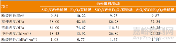 在施加磁場(chǎng)環(huán)境中,分別制備不同SiO2NW@Fe3O4添加量的環(huán)氧涂層,測(cè)試涂層的斷裂伸長(zhǎng)率、拉伸強(qiáng)度、沖擊強(qiáng)度和斷裂韌性,結(jié)果如表2所示。