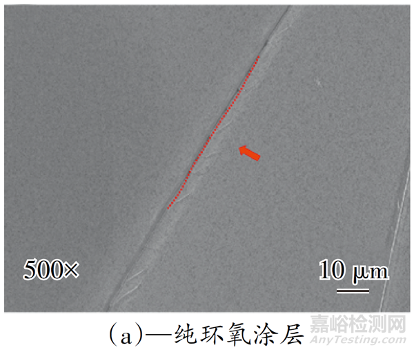 從表3可以看出,不同納米填料的添加對(duì)涂層的斷裂伸長(zhǎng)率基本無(wú)影響,這主要是由于涂層的斷裂伸長(zhǎng)率主要取決于環(huán)氧樹(shù)脂自身化學(xué)結(jié)構(gòu),納米無(wú)機(jī)填料的添加基本不會(huì)改變涂層的彈性;長(zhǎng)粒徑SiO2NW相比于納米Fe3O4粒子,更有利于涂層強(qiáng)度及剛性的提升,這是由于SiO2NW的長(zhǎng)徑比使其對(duì)裂紋的擴(kuò)展更均勻。添加SiO2NW@Fe3O4后,在微磁場(chǎng)中固化的環(huán)氧涂層的剛度和強(qiáng)度顯著提升,這主要是由于涂層的剛度和強(qiáng)度與裂紋產(chǎn)生及擴(kuò)展性能相關(guān)。在微磁場(chǎng)中固化的涂層,內(nèi)部的SiO2NW@Fe3O4的排列方向與測(cè)試時(shí)的拉伸及彎曲應(yīng)力垂直,可有效抑制涂層應(yīng)力方向擴(kuò)展裂紋的產(chǎn)生,且擴(kuò)展應(yīng)力與SiO2NW@Fe3O4的界面脫黏方向垂直,需要更大的外力使其脫黏,因此添加SiO2NW@Fe3O4并在微磁場(chǎng)環(huán)境下固化的環(huán)氧涂層的拉伸強(qiáng)度、彎曲強(qiáng)度、沖擊強(qiáng)度及斷裂韌性均顯著提升。