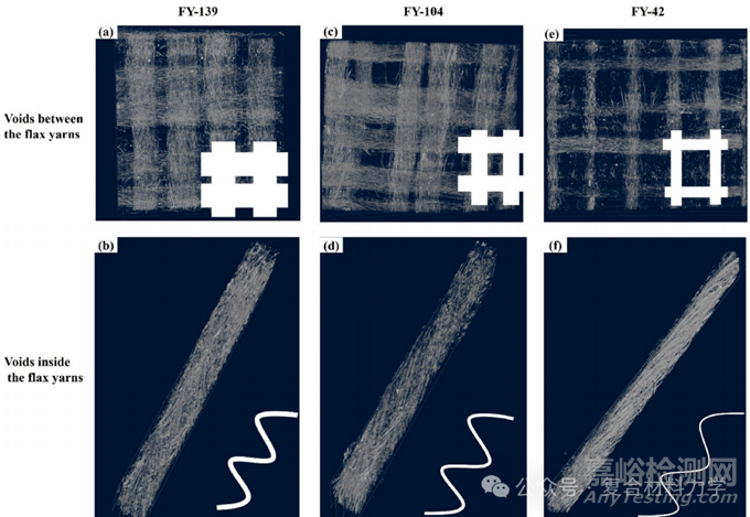 圖4 CFRCs的顯微CT圖像:(a,b)139 Tex;(c,d)104Tex;(e,f)42Tex。