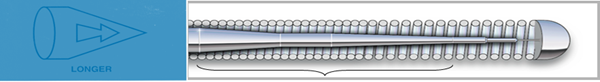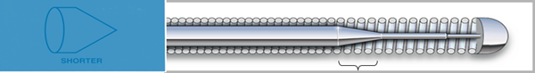 b.核芯錐體較長:增強導絲跟蹤性,不易產(chǎn)生導絲下垂,多用于針對迂曲血管設計的導絲。