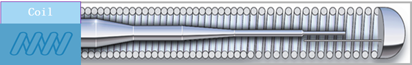 核芯是導絲最基本的構(gòu)架,制造材料主要有不銹鋼、鎳鈦合金或高張力不銹鋼等,呈圓柱狀,并貫穿導絲全長;其遠端部分可呈錐形、階梯形或流線形,又稱錐體核芯。有人將錐體核芯按功能分為3個節(jié)段,近段部分包括推送桿,主要對器械的輸送起支撐作用,又稱工作區(qū);遠段部分直徑均勻,最細、最柔軟,為塑型段;兩者之間為過渡段。