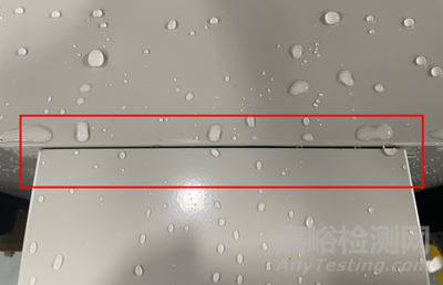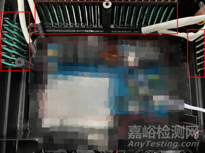 某款新風(fēng)機(jī),由于符合管道扇結(jié)構(gòu),產(chǎn)品標(biāo)準(zhǔn)要求需進(jìn)行IPX2試驗(yàn)。測(cè)試后經(jīng)拆機(jī)檢查發(fā)現(xiàn)有水從接線盒端蓋頂部縫隙進(jìn)入到內(nèi)部帶電部件,從產(chǎn)品標(biāo)準(zhǔn)的判定考核,水跡導(dǎo)致了絕緣部位不符合爬電距離限值的要求,不符合GB 4706.1-2005標(biāo)準(zhǔn)第15.1條款要求,見圖3。