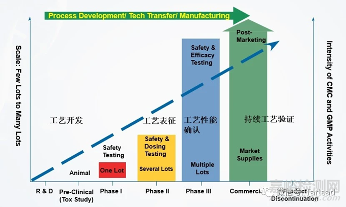1.工藝經(jīng)過驗證后,產(chǎn)品生命周期內(nèi)將繼續(xù)對工藝進行持續(xù)監(jiān)測與評價以確保工藝和產(chǎn)品質(zhì)量始終處于受控狀態(tài)。對前階段建立的工藝輸入和相應(yīng)輸出關(guān)系的理解是持續(xù)工藝確認(CPV)成功的基礎(chǔ)。根據(jù)對工藝的理解程度分為兩個階段:第一階段仍然需要一定程度的加強檢測與監(jiān)控,直到收集到的足夠數(shù)據(jù)能有效地評估工藝波動;第二階段在建立相應(yīng)的控制限后,主要為常規(guī)的監(jiān)控同時根據(jù)工藝相關(guān)的變更或偏差回顧,適當?shù)碾A段性調(diào)整部分參數(shù)的監(jiān)控或檢測的強度或頻率。持續(xù)工藝確認實施主要包括以下方面: