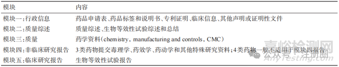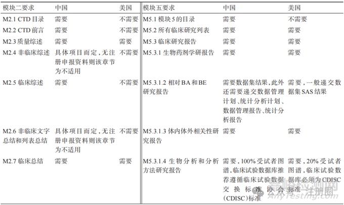 ICH M4 為人用藥品注冊(cè) CTD 文檔,注冊(cè)申報(bào)資料分為 5 個(gè)模塊[8],主要內(nèi)容見表 2。eCTD 是將符合CTD規(guī)范的藥品申報(bào)資料電子化,能夠?qū)崿F(xiàn)電子申報(bào)資料提交、接收、驗(yàn)證、受理、審評(píng)和電子存檔全過程操作,使藥品全生命周期管理和文檔儲(chǔ)存更加簡(jiǎn)潔明了,提高了審評(píng)機(jī)構(gòu)審評(píng)效率,促進(jìn)藥品全球同步研發(fā)[9]。國家藥品監(jiān)督管理局于2020年發(fā)布《化學(xué)藥品注冊(cè)分類及申報(bào)資料要求》,明確了所有藥物的臨床試驗(yàn)、藥品上市注冊(cè)及化學(xué)原料藥申請(qǐng)均需按照 ICH M4 的 CTD 格式進(jìn)行申報(bào)[4]:模塊一為區(qū)域性文件,因不同國家地區(qū)而異;ANDA不要求非臨床研究,所以一般不包含模塊四[10-11];中國、美國仿制藥申報(bào)模塊二與模塊五區(qū)別在于我國目前實(shí)行電子資料申報(bào),而美國實(shí)行eCTD申報(bào),兩國CTD模塊二與模塊五資料要求見表3。