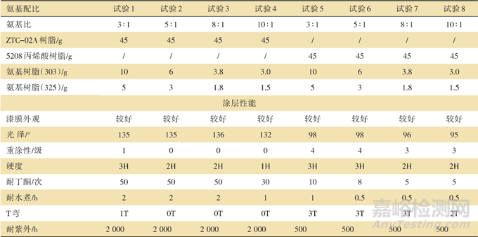 注:(1)表中“氨基比”為主體樹(shù)脂與氨基樹(shù)脂的重量比;(2)對(duì)比實(shí)驗(yàn)中,引入了苯代氨基樹(shù)脂和封閉性異氰酸酯固化劑,進(jìn)一步提升產(chǎn)品綜合性能;(3)各實(shí)驗(yàn)配方的其他組分,詳見(jiàn)1.2節(jié)水性烤漆制備中的各組分重量。