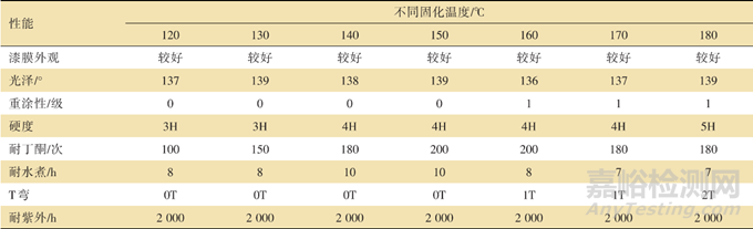 由表3可知,隨著固化溫度的逐步升高,涂層光澤度變化不明顯;重涂性呈下降趨勢(shì);硬度呈升高趨勢(shì);耐丁酮能力先增強(qiáng)后降低;耐水煮性能也是先增強(qiáng)后降低;T彎性能逐步下降;耐紫外性能保持不變。