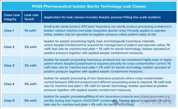 The PHSS defines five classes of Isolator barrier leak integrity with each class corresponding to the relative %volume per hour leak rate: