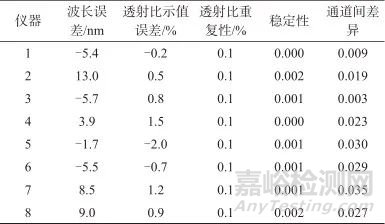 選擇不同型號的茶多酚檢測儀進行試驗,不同型號茶多酚檢測儀校準結果見表1。由表1可知,進行實驗的8臺儀器,其中第2臺設備的波長超出了計量特性要求,另外7臺均符合要求。所測大部分產品波長最大允許誤差、透射比示值誤差、重復性、穩(wěn)定性和通道間差異在本校準方法提出的計量性能要求范圍內,表明所提出的要求較為合理。通過觀察所檢測的數據,波長誤差均較大,通道間差異也較為明顯,儀器可以從這兩方面進行改進。