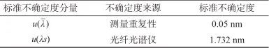 為標準器光纖光譜儀測量3次的平均值,測量結果的不確定度主要來源于測量重復性和標準器引入的不確定度分量,兩個變量之間不存在相互依賴的關系,二者不相關,因此合成標準不確定度計算公式見式(7)~(9):