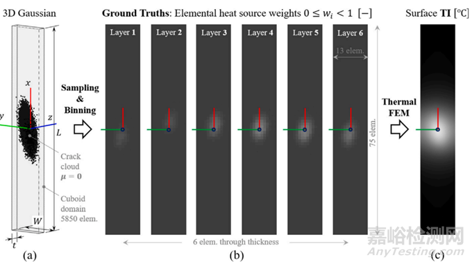 用于訓(xùn)練和驗(yàn)證深度學(xué)習(xí)模型的基準(zhǔn)數(shù)據(jù)(ground truths,GTs)是通過在標(biāo)準(zhǔn)疲勞測試試樣上應(yīng)用三維高斯概率密度函數(shù)(probability density function;PDF)來定義的,該函數(shù)用于模擬復(fù)合材料內(nèi)部任意形狀的損傷。生成過程包括在Matlab軟件中隨機(jī)選擇協(xié)方差矩陣的元素,確保生成的PDF是半正定的,接著通過采樣創(chuàng)建代表材料內(nèi)部微觀裂紋的點(diǎn)云。隨后,將這些點(diǎn)分布到與有限元尺寸相對應(yīng)的實(shí)體中,以模擬由于損傷引起的自熱效應(yīng)。此外,還考慮了粘彈性熱耗散,將其作為體積均勻的熱源進(jìn)行建模。通過這種方式,為每個(gè)層生成了一組GTs,它們以灰度圖像的形式表示,其中亮度對應(yīng)于權(quán)重值,這些圖像隨后用于合成熱表面圖像的生成和模型訓(xùn)練。