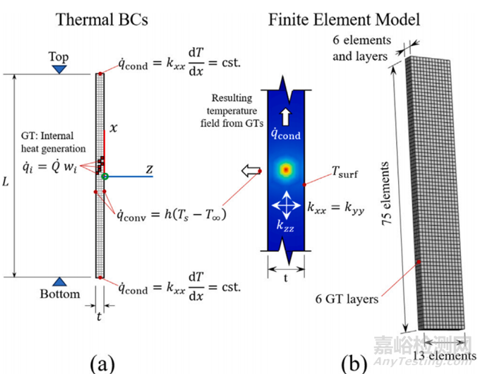 圖2(a) 熱邊界條件應(yīng)用于熱模型,恒定傳導(dǎo)通量條件應(yīng)用于頂端和底端,通過薄膜系數(shù)?應(yīng)用于與環(huán)境流體接觸的自由表面的自然對流傳熱條件,以及(b)Comsol中有限元網(wǎng)格的離散化域。