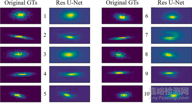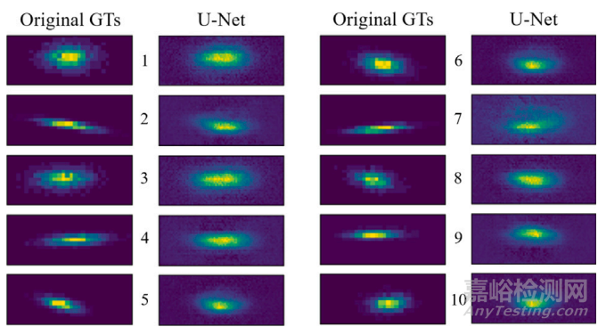 圖5 10個(gè)原始GT樣本(左)和U-Net對第1層所示測試數(shù)據(jù)集的相應(yīng)預(yù)測(右);(平均均方誤差=7.66)。
