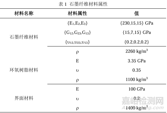 層合板的構造由多層材料組成,每層包含T300型號的石墨纖維、DY063型環(huán)氧樹脂以及特別設計的界面材料。在此模型中,石墨纖維被假設為橫向各向同性材料,并以正交各向異性材料進行模擬;而界面材料和環(huán)氧樹脂則被視為各向同性材料。在纖維增強復合材料的微觀結構中,界面區(qū)域由纖維和基體的近表面層以及這兩個表面之間的過渡材料層組成。界面的力學性能,無論是過于薄弱還是過于剛硬,均會對復合材料的整體性能產(chǎn)生顯著影響。因此,選擇具有最佳力學性能的界面材料對于提升復合材料的綜合性能至關重要。本模型中,界面的彈性屬性被設定為介于纖維和基體之間,既不過于剛硬也不過于柔軟,以期達到最佳的力學匹配效果。
