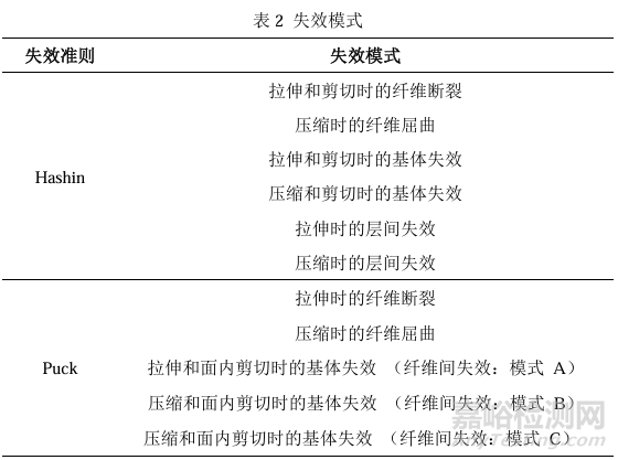 在進行復合材料圓柱體在特定載荷作用下的失效分析時,可以采用兩種專門針對復合材料的失效判據(jù):Hashin準則和Puck準則。這些準則是復合材料力學領域的先進理論,它們綜合考慮了材料在多軸應力狀態(tài)下的復雜行為,包括在拉伸和壓縮載荷作用下可能出現(xiàn)的不同失效模式。具體而言,Hashin準則和Puck準則能夠識別和預測復合材料在不同載荷組合下的失效行為,從而為復合材料結構的設計和安全性評估提供了科學依據(jù)。表2詳細列出了這兩種準則所涵蓋的失效模式,為復合材料的失效分析提供了明確的參考標準。