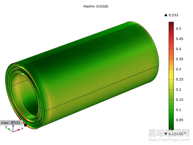 如圖8(a)和圖8(b)所示,復合材料圓柱體的Hashin和Puck失效判據(jù)的失效指數(shù)分布圖揭示了失效風險的不均勻性。在Hashin失效準則的應用下,失效指數(shù)的最大值出現(xiàn)在圓柱體的外層,且特別集中在朝向載荷端的區(qū)域。相對地,在Puck失效準則的應用下,失效指數(shù)的峰值則位于圓柱體的第二層,即從內側向載荷端過渡的區(qū)域。值得注意的是,即使在圓柱體的內層和外層,Puck準則同樣預測出了較高的失效指數(shù),表明這些區(qū)域可能面臨較高的失效風險。