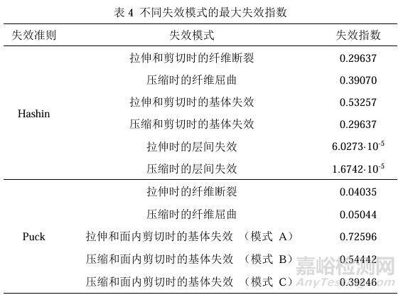 表4詳細列出了在兩種不同的失效準則下,復合材料結構在細觀力學分析中的各個失效模式所對應的最大失效指數(shù)。這些指數(shù)的數(shù)值分析結果明確指出,在拉伸載荷作用下,基體材料是該復合材料結構中最先達到失效臨界狀態(tài)的組分。這一發(fā)現(xiàn)對于理解復合材料的失效機制和預測其在實際應用中的性能具有重要的理論和實際意義,同時也為復合材料結構的設計優(yōu)化和性能提升提供了科學依據(jù)。
