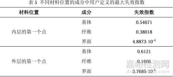 表5詳細列出了在宏觀力學分析中識別的兩個關鍵材料位置的成分失效指數(shù)的最大值。這些位置被選為臨界點,意味著它們在結構中承受著較高的應力集中,可能對材料的整體性能產(chǎn)生顯著影響。通過分析這些位置的失效指數(shù),可以更深入地理解材料在這些關鍵區(qū)域的失效風險,為復合材料結構的強度評估和優(yōu)化設計提供重要的數(shù)據(jù)支持。