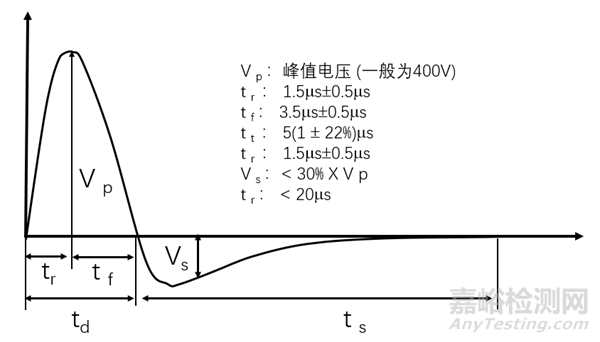 試驗的方法是在設備的電源線上,以5 - 10Hz的重復頻率,施加圖1所示的脈沖電壓,正負極性的脈沖分別進行試驗,觀察設備是否會出現(xiàn)敏感現(xiàn)象。