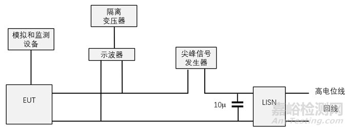直接在電源線上以差模的形式注入干擾,只不過這里施加干擾的設備是尖峰信號發(fā)生器,而不同于CS101中使用(信號發(fā)生器+功率放大器+耦合變壓器)。這里示波器同樣需要使用隔離變壓器供電,防止電源線對地短路。