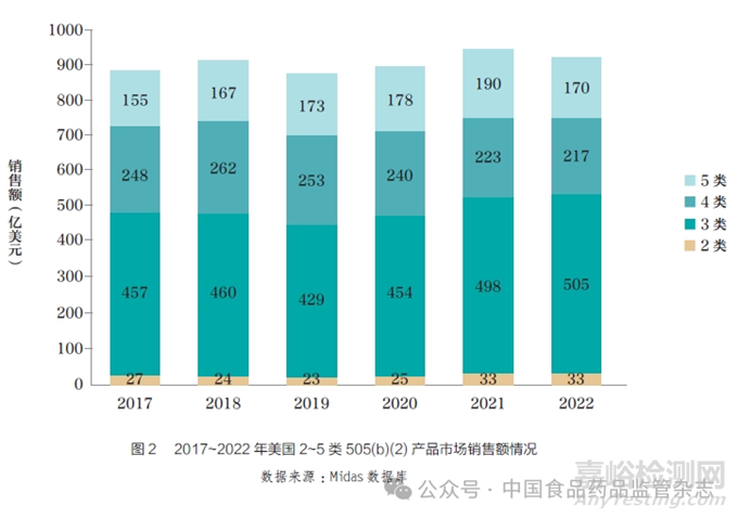 本文通過Midas 數(shù)據(jù)庫對我國已批準(zhǔn)的2.1~2.3 類改良型新藥進行一一檢索,結(jié)果顯示共有22個品種在該數(shù)據(jù)庫中擁有銷售額,2022 年和2023 年上半年的總銷售額分別為4830 萬美元和4290 萬美元。由于數(shù)據(jù)庫無法區(qū)分適應(yīng)癥,在商品名、劑型、規(guī)格一致的情況下,無法判斷銷售額來自新藥還是改良型新藥,故與美國的6 類、9 類和10 類505(b)(2) 產(chǎn)品一樣,也不將此類產(chǎn)品納入研究。