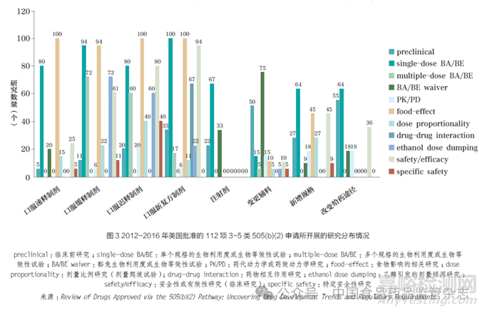 從劑型角度來看,有研究者統(tǒng)計分析發(fā)現(xiàn),2012~2016 年獲批的226 項505(b)(2) 申請中,擁有完整審評信息的3~5 類產(chǎn)品申請有112 項,其中口服速釋制劑、口服緩釋制劑、口服遲釋制劑(腸溶制劑)、口服新復(fù)方制劑、注射劑、變更輔料、新增規(guī)格和改變給藥途徑的申請分別為20 項、18 項、5 項、18 項、9 項、20 項、11 項和11 項。結(jié)果顯示,上述申請中,獲得生物等效性或生物利用度試驗豁免的分別占比20%、0%、0%、0%、33%、75%、9% 和18% ;需要開展安全有效性研究(不含特定安全性研究)的分別占比25%、61%、80%、94%、0%、10%、45% 和36% ;需要開展臨床前研究的分別占比5%、11%、20%、33%、20%、50%、27% 和55%[7]。從這些數(shù)據(jù)不難看出,美國FDA 對口服速釋制劑、注射劑、變更輔料的505(b)(2) 申請,要求相對較低(圖3)。